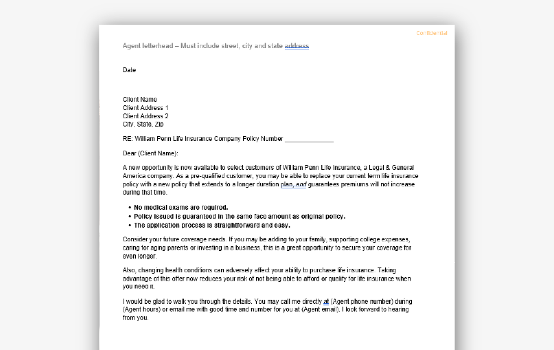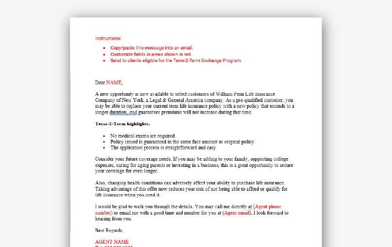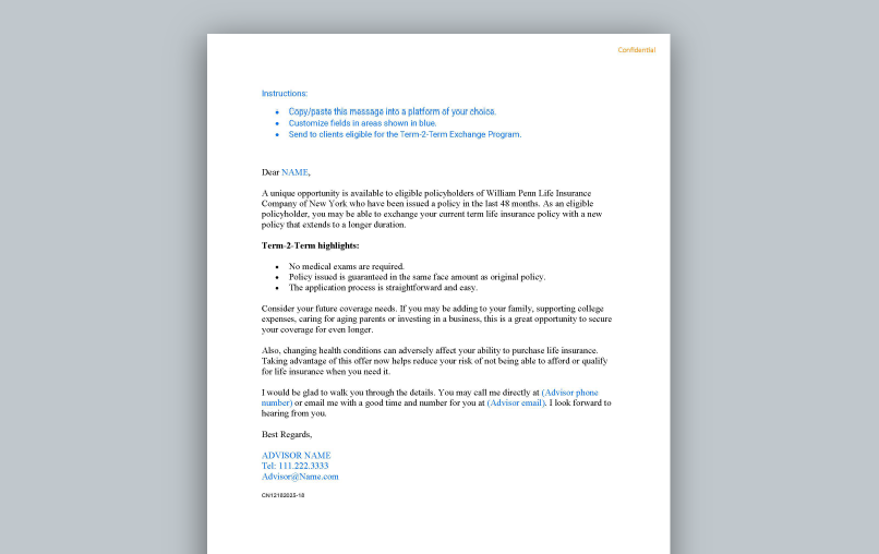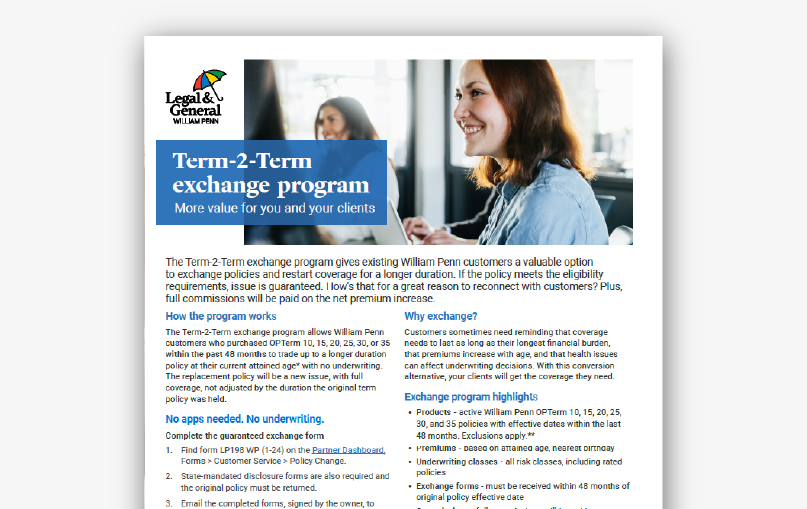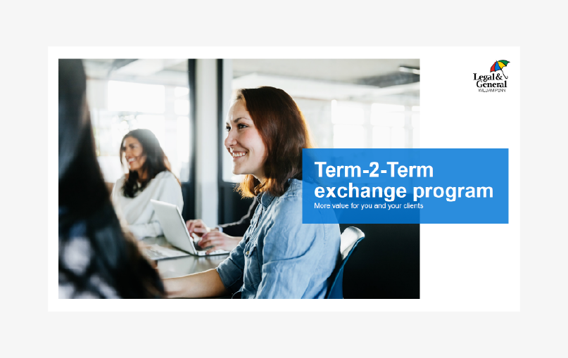 - Term-2-Term exchange – Clients extend coverage without new medical exams.