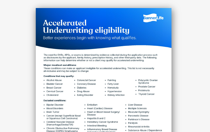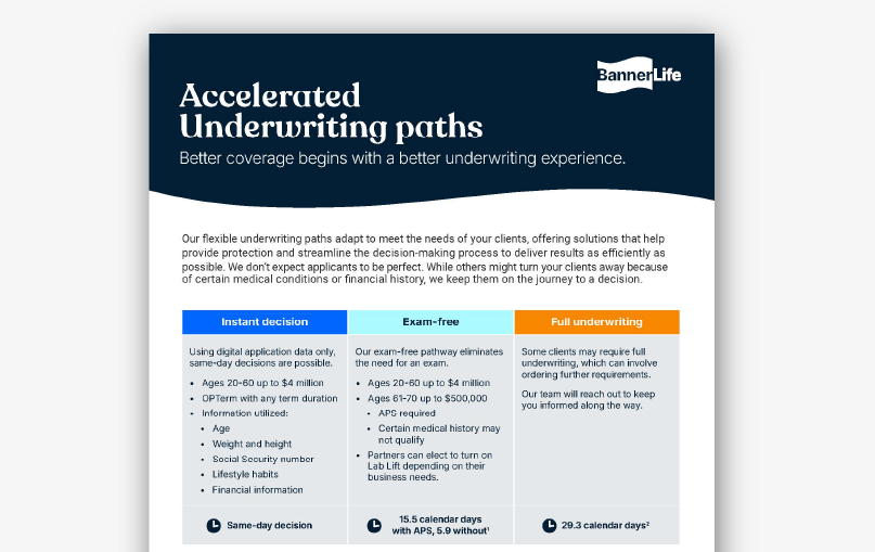 Review the ways we can get your clients a quick underwriting decision in the chart below or learn all our underwriting here: https://www.bannerlife.com/advisor/our-approach/horizon-experience